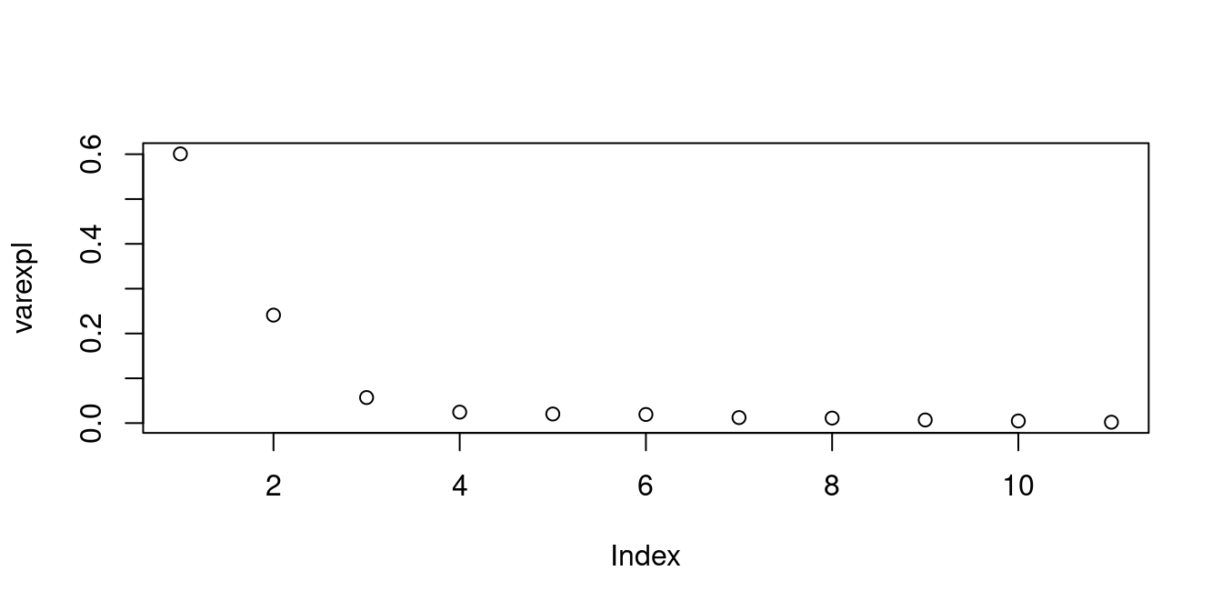 Y=mtcars$mpgX=model.matrix(mpg~., data =mtcars)[,-1]|>scale()## principal component analysispca=prcomp(X)P=pca$x#full matrix of all principal components## variance explainedeigenval=pca$sdev^2varexpl=eigenval/sum(eigenval)cumsum(varexpl)
