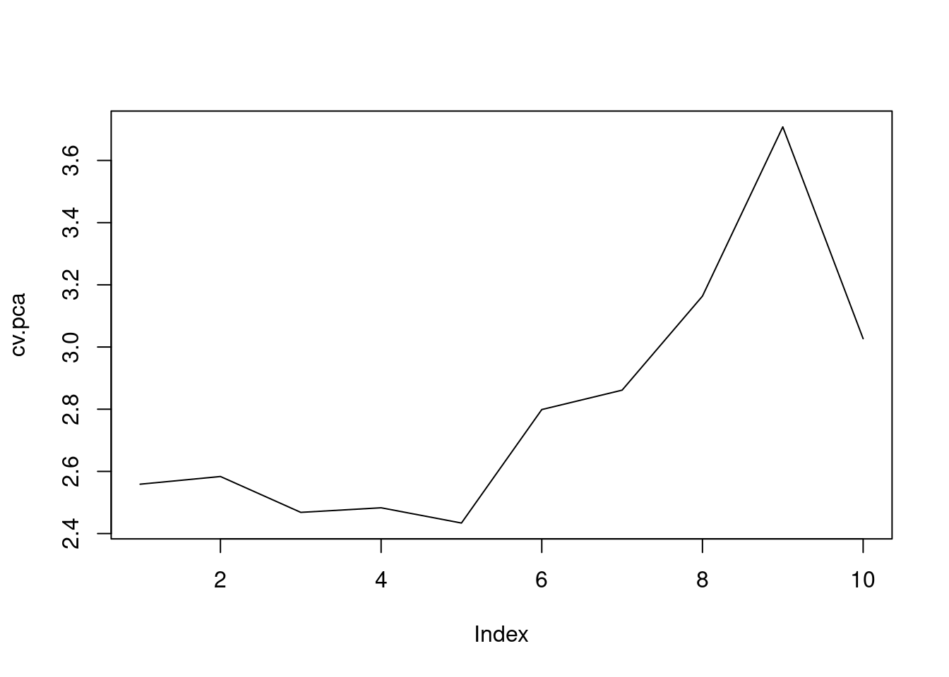 myfunc.cvpca=function(p){data_pca=data.frame(Y, P[,1:p])cv=train(Y~., data =data_pca, method ="lm", metric ="RMSE", trControl =trainControl(method ="cv", number =10))return(cv$results$RMSE)}# Iterate function crossval over ncomp = 1, ..., maxcompmaxcomp=10# select not more than number of variables (for data_small select <=4)cv.pca=sapply(1:maxcomp, myfunc.cvpca)# sapply is useful for iterating over function arguments ncomp# Find the number of components with the lowest RMSPEwhich.min(cv.pca)